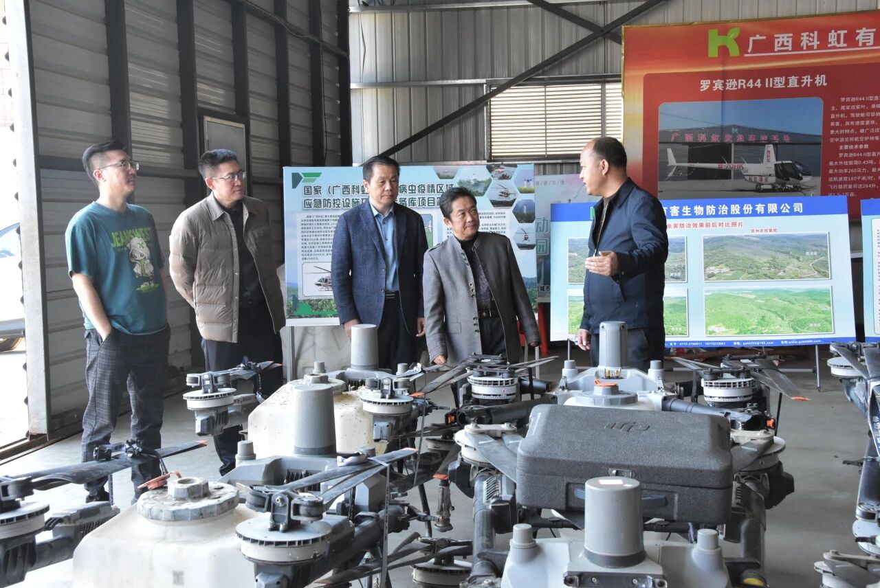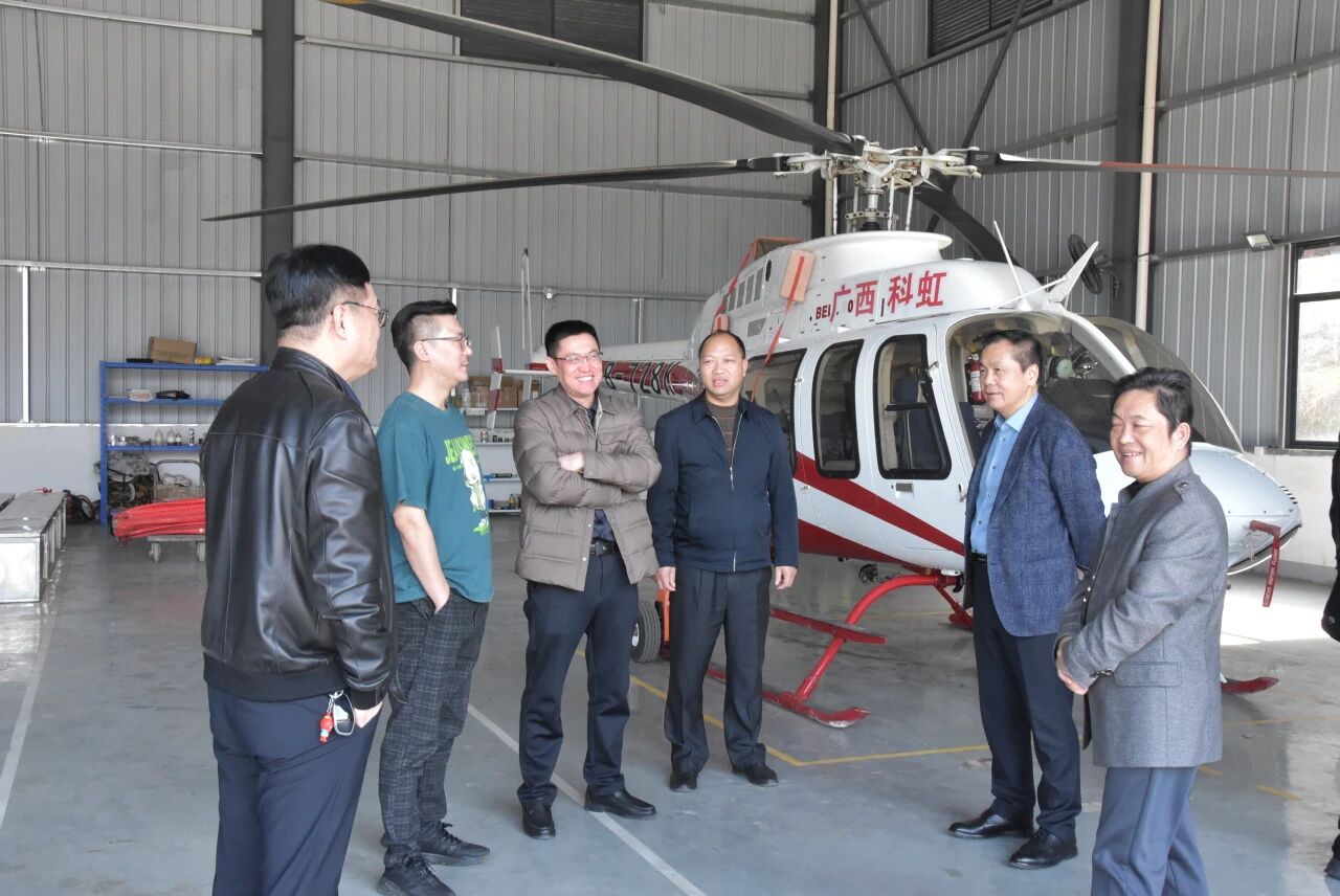 调研伊始,张义董事长一行在杨自华、黄大亮副总经理的陪同下,走进广西科虹应急储备库。作为区域内重要的应急保障平台,储备库内整齐陈列着低空作业设备、应急救援物资、有害生物防治器械等各类物资。杨自华副总经理重点介绍了科虹通用航空运营的直升机、多旋翼无人机等低空装备在应急救援、物资投送、灾害监测等场景的应用案例,详细讲解了设备储备标准、调度流程及实战效能。张义董事长一行不时就装备性能、作业半径、应急响应效率等问题交流探讨,对科虹公司在低空应急保障领域的扎实布局给予高度认可。