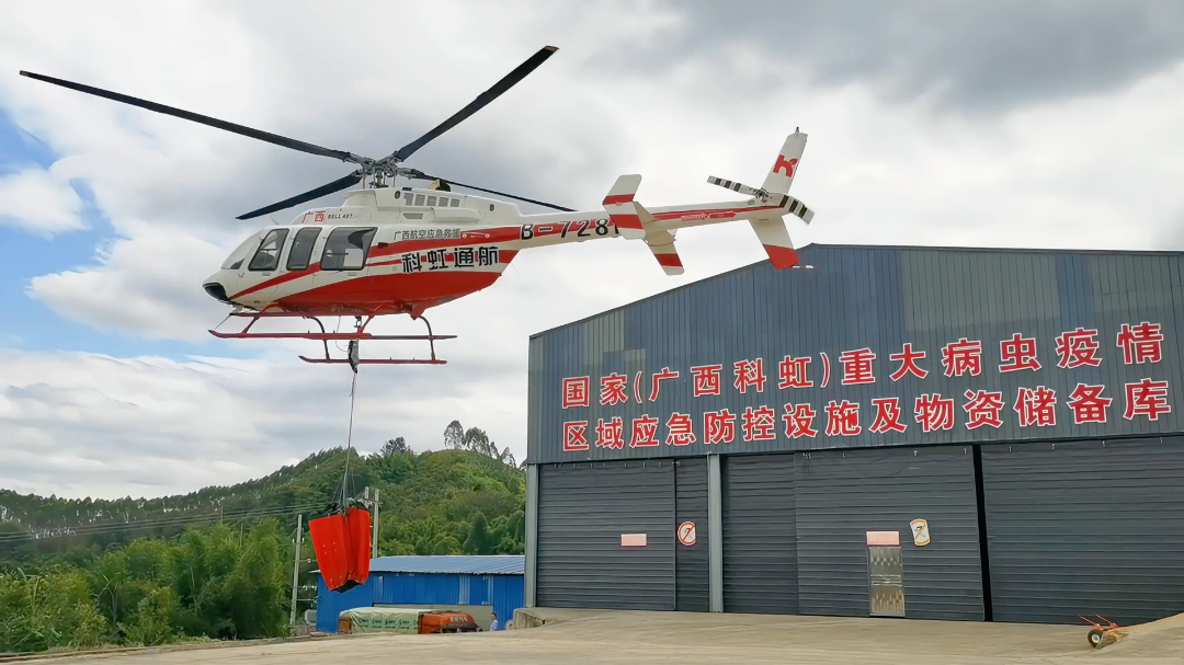 左右两侧火线在两支队伍扑打下,明火基本控制,但是火借风势,在山腰处出现两处明火,并有向山顶发展的趋势,北坡陡峭悬崖成为灭火盲区,人力无法抵达,此时,广西科虹贝尔407直升机接到指挥命令,立即完成飞行前准备,赶赴火场。