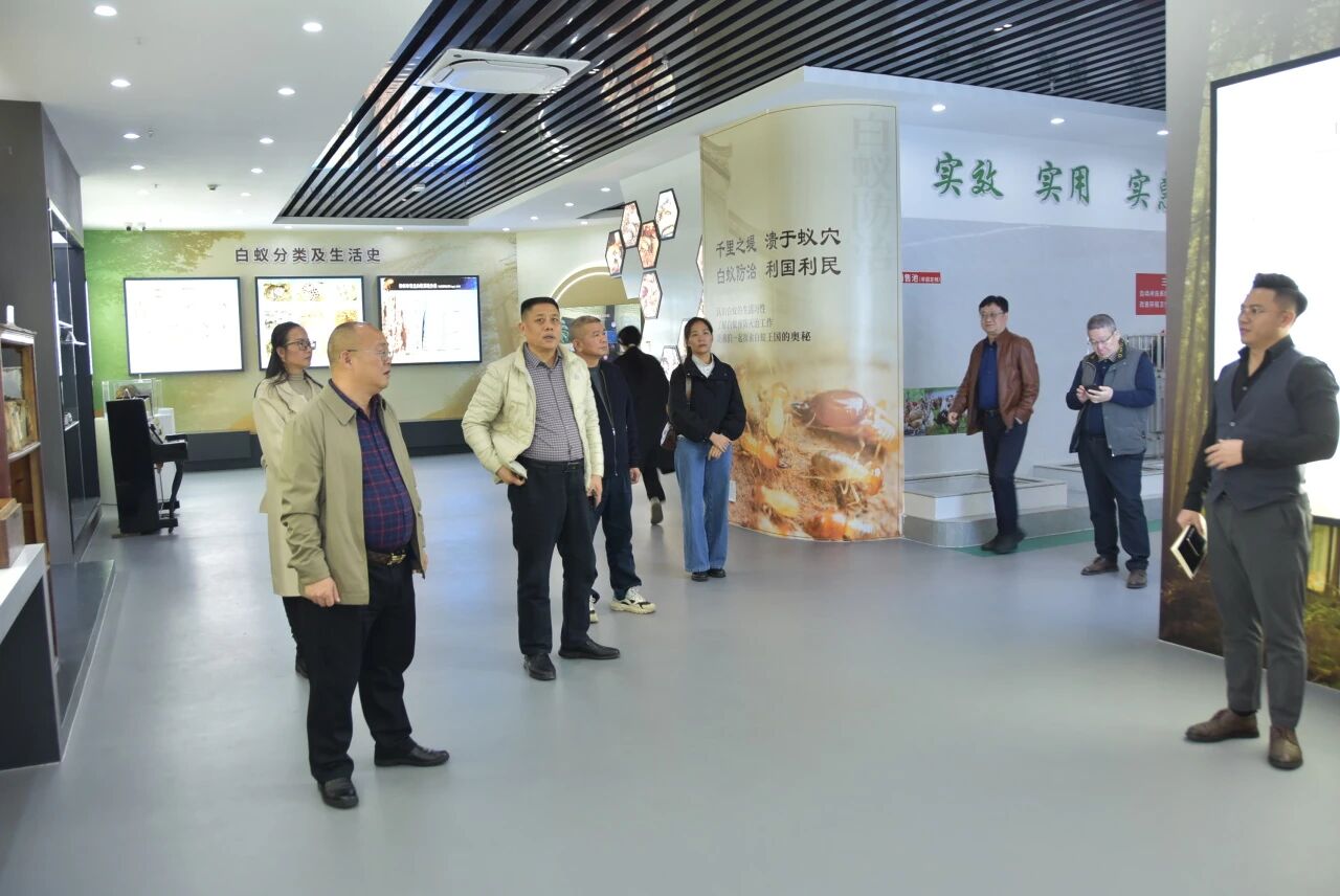 调研期间,黄冕林场副场长曾有杰一行首先走进科虹有害生物科普馆,重点观摩红火蚁及林业病虫害防治相关展区。从红火蚁监测诱杀演示、生物防治药剂研发成果展示,到林业重大病虫害应急防控流程模拟,再到无人机、智能化监测设备在林业病虫害防治中的实操讲解,全方位了解科虹公司在有害生物防治领域的技术体系与实战经验。